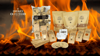 Smokey Olive Wood dovanų rinkinys su alyvmedžio lentelėmis kepimui ir drožlėmis rūkymui