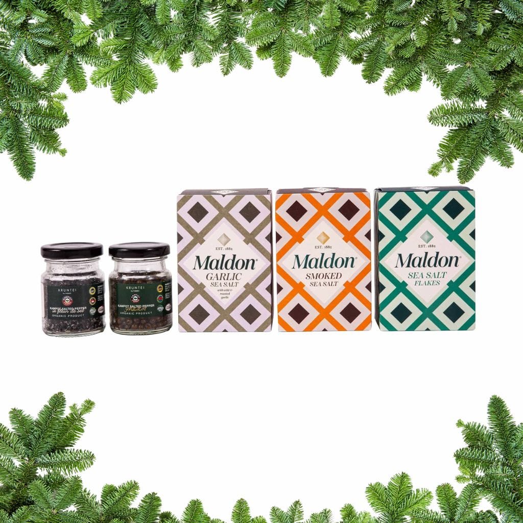 Rinkinį sudaro 2 vnt. Kampoto pipirų ir 3 vnt. Maldon druskos
