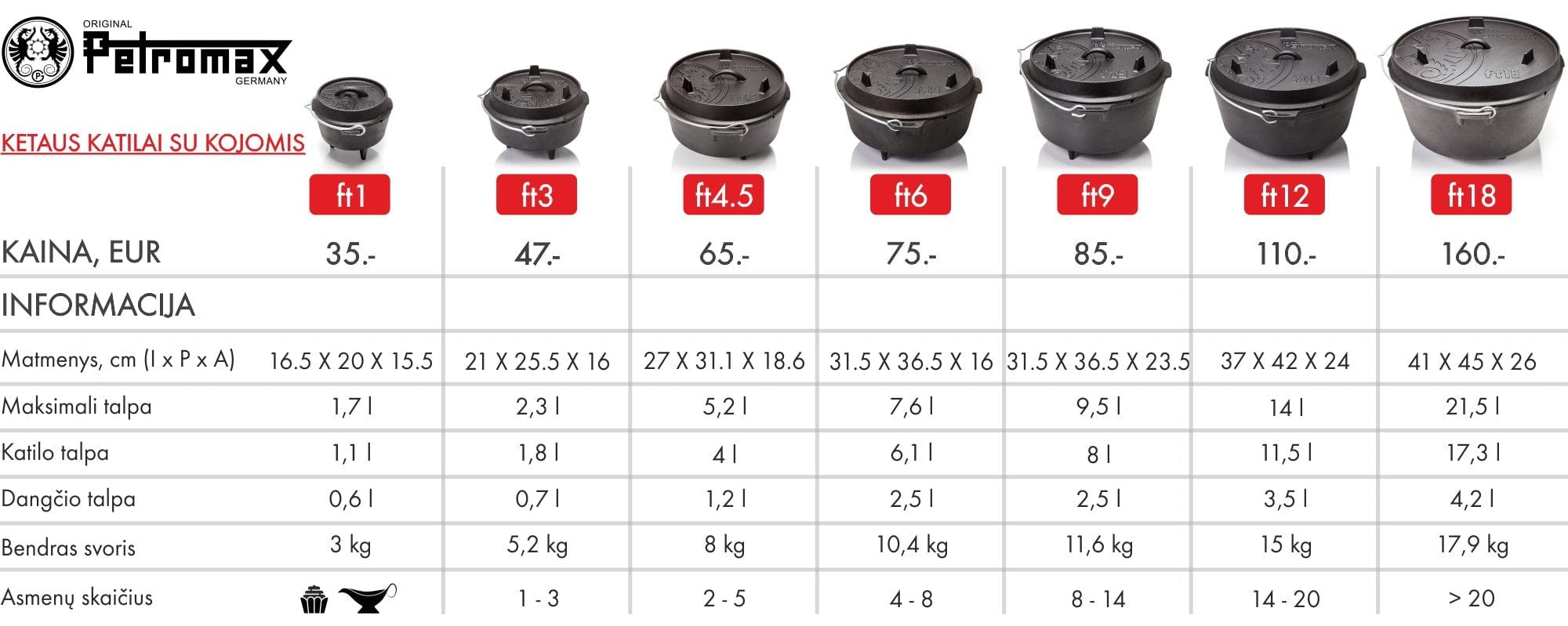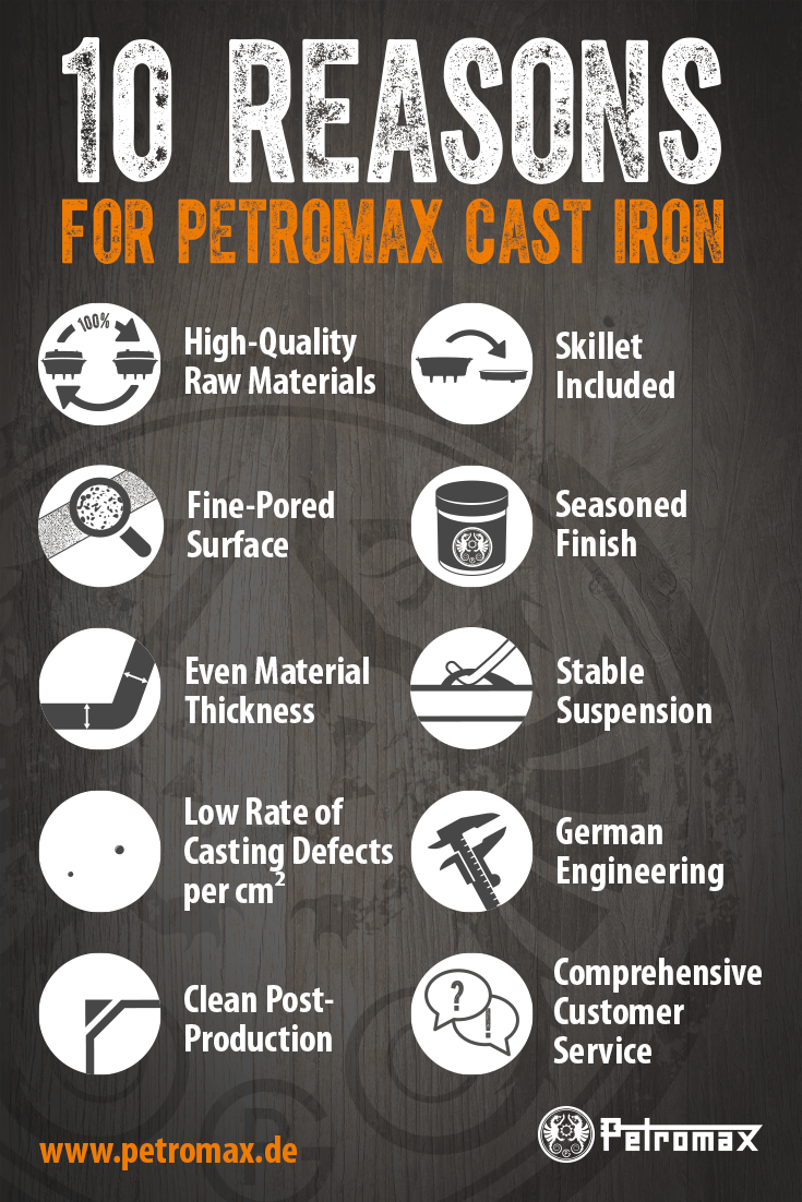 PETROMAX boilers are scratch-resistant, long-lasting, durable and high quality. Excellent heat distribution and resistance to high temperatures. The porous cast-iron surface absorbs grease well, creating a natural, non-burning surface.