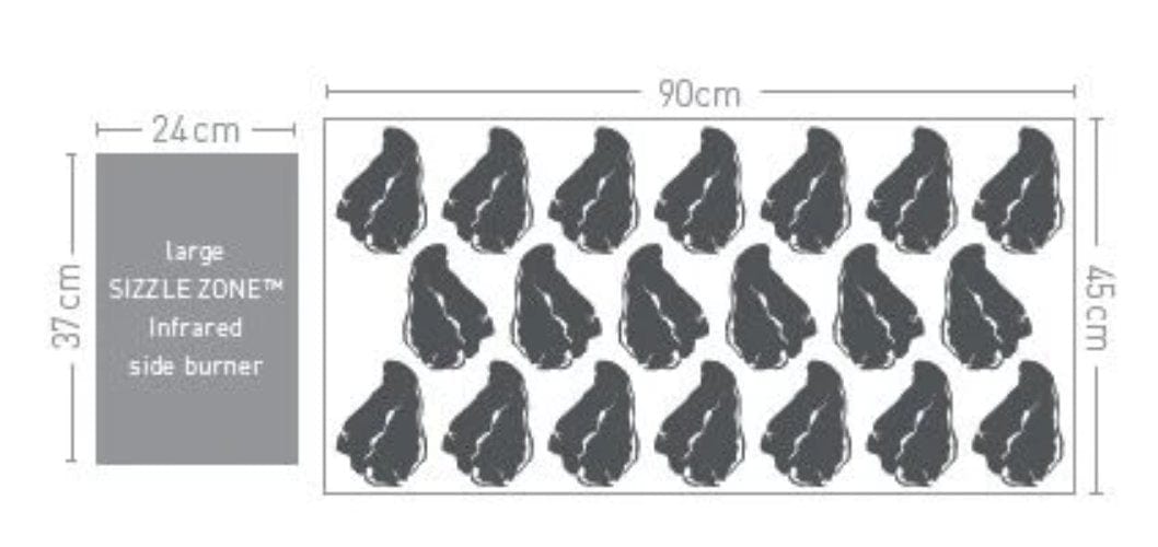 - Main cooking grids of 7 mm stainless steel: 90 x 45 cm. Holds 20 steaks or even 37 burger patties!