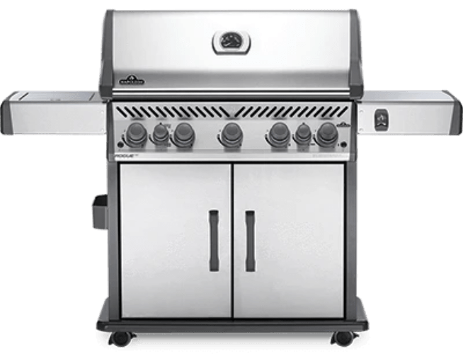 The new powerful NAPOLEON Rogue SE625RSIBPSS-1 gas grill has 5 main burners, a Sizzle Zone side burner and a horizontal internal burner for the rotating spit.
