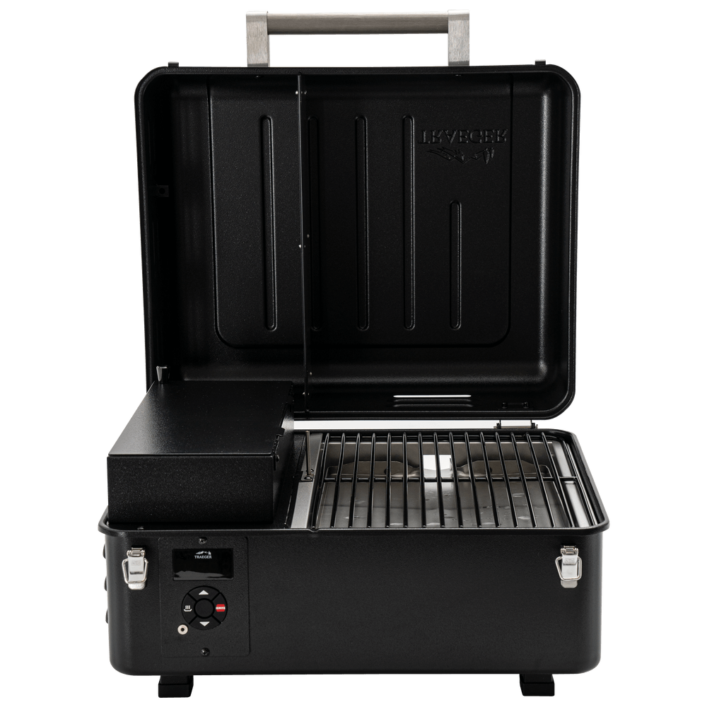 The TRAEGER Ranger pellet smoker features a convenient "suitcase" design - the lid not only opens and closes easily, but also locks into place with hooks" So the handle that is used to lift the lid can also be used to lift and carry the grill.