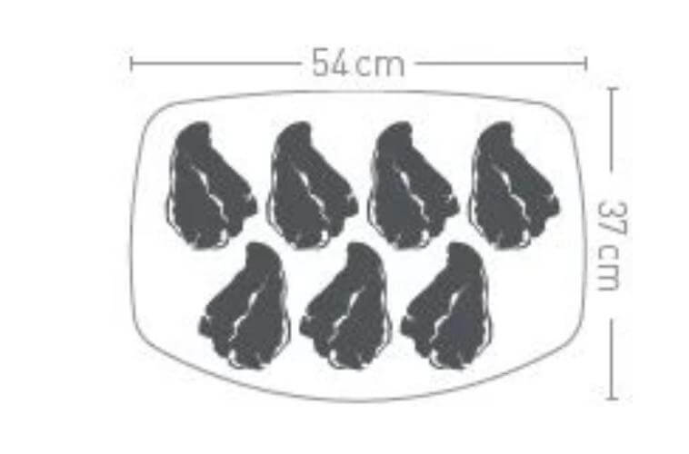 - Viļņoto, divdaļīgo cepšanas restu “Wave” cepšanas virsma ir 54×37 cm. Vienlaikus uz tās varētu grilēt 17 hamburgerus.