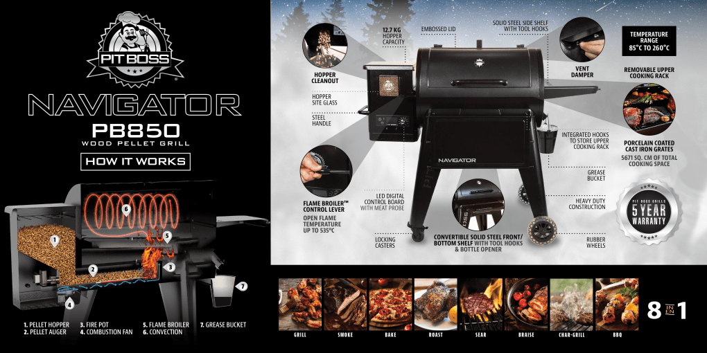 Pilnībā automatizēts grils/kūpinātavas bedres boss navigators PB850G ar tiešām un netiešām graudu funkcijām. Papildu piederumu var izmantot aukstai smēķēšanai - smēķēšanas skapis ir uzstādīts grila pusē.