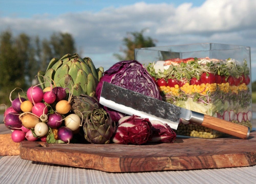 Ar šo unikālo 100 % roku darba izkalto nazi jūs nevarēsiet pārstāt griezt! Tas ir grezns nazis, ko ir iedvesmojusi tradicionālais kalēju amats, ar izteiksmīgiem asmeņu rakstiem un ergonomisku olīvkoka rokturi. Vegetable nazis ir paredzēts zaļumu, dārzeņu sasmalcināšanai un sagriešanai kubiņos.