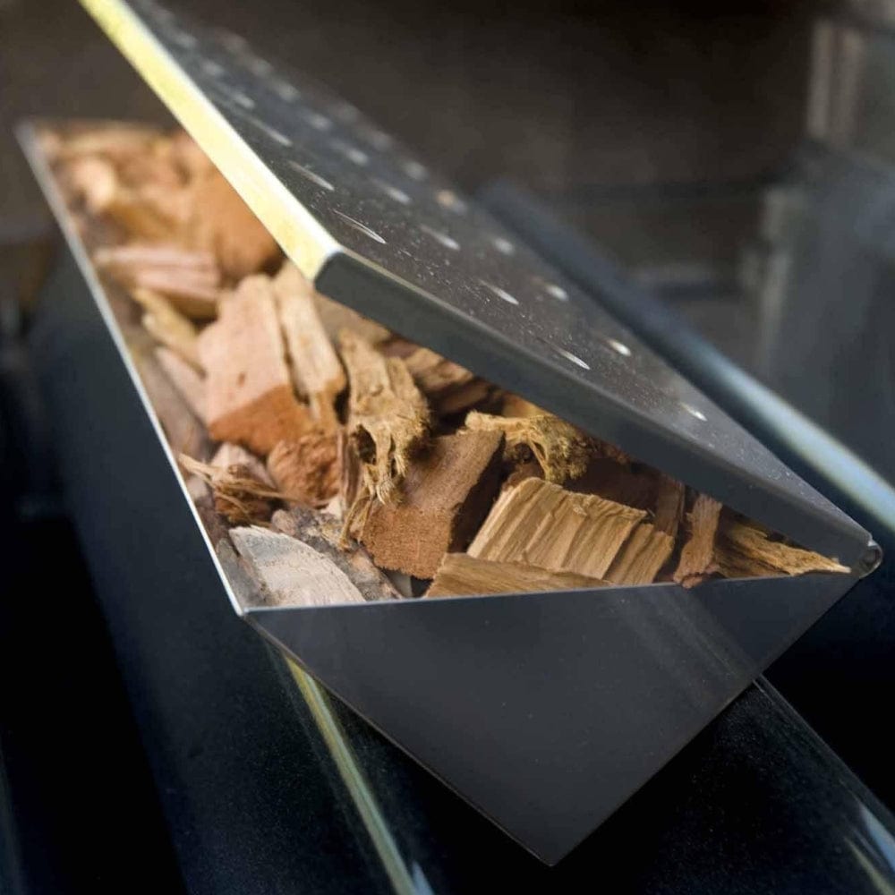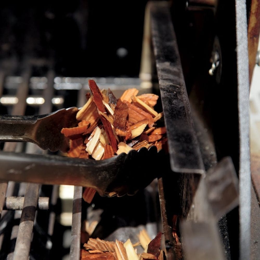 - Izmērcētās skaidas uzmetiet tieši uz oglēm vai kvēlojošām oglēm. Ja kūpināsiet gāzes grilā, lietojiet kūpināšanas cilindru. Atcerieties uzlikt vāku.